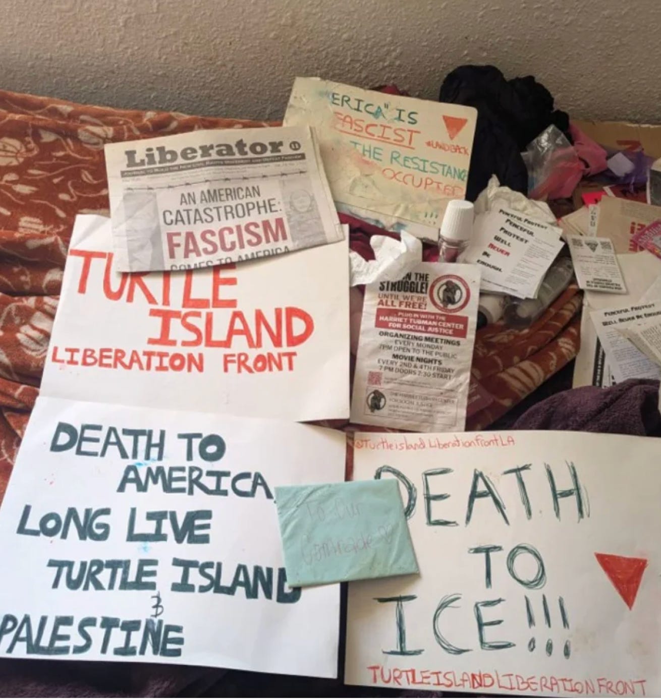 The timing of the arrests and massive media attention accusing the newly formed Turtle Island Liberation Front was a leftist pro Palestinian anti ICE and anti-capitalist “terrorist” group supports the Trump agenda of fear as outlined in September 25, 2025 National Security Presidential Memorandum (NSPM-7) called “Countering Domestic Terrorism and Organized Political Violence”.