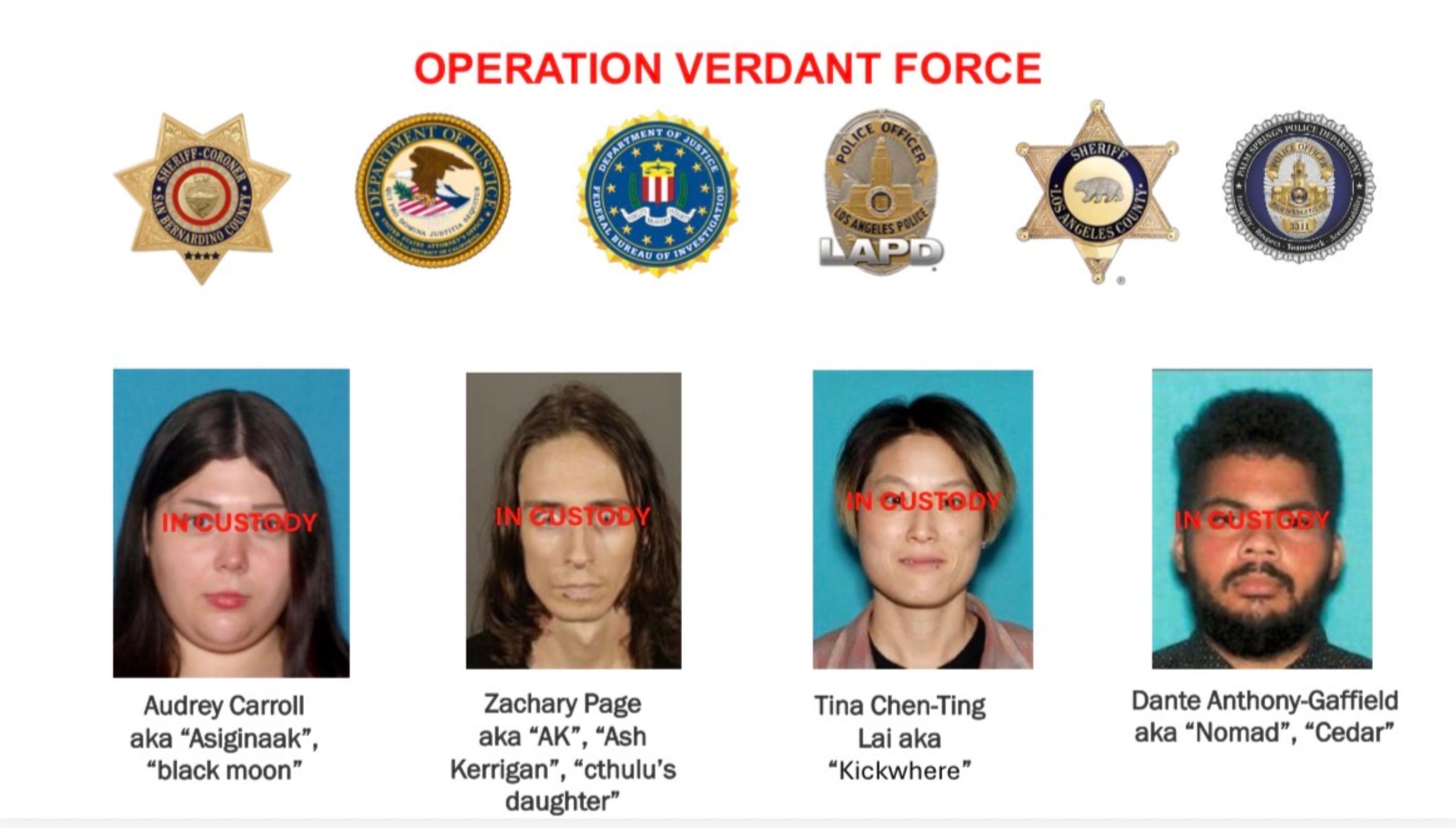 Audrey Carroll, 30 , Zachary Page, 32, Dante Gaffield, 24 and Tina Lai, 41 were arrested in what is likely an FBI invented terrorist plot.