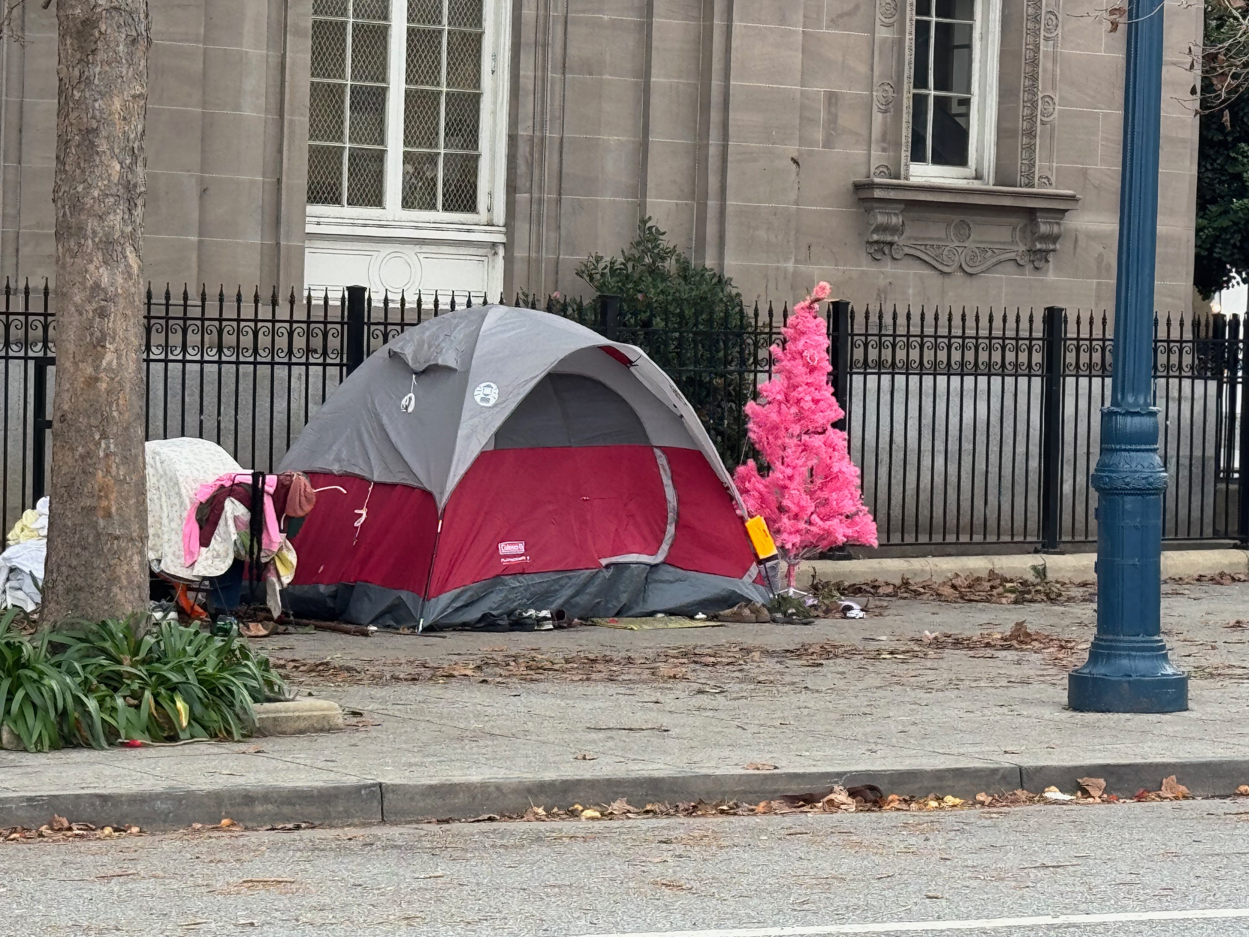 The longest night of the year promised to be another cold struggle for our homeless friends. A new row of pup tents is bracing against the downtown Santa Cruz Post Office metal fence. A bright pink Christmas Tree stood triumphal outside the first tent.