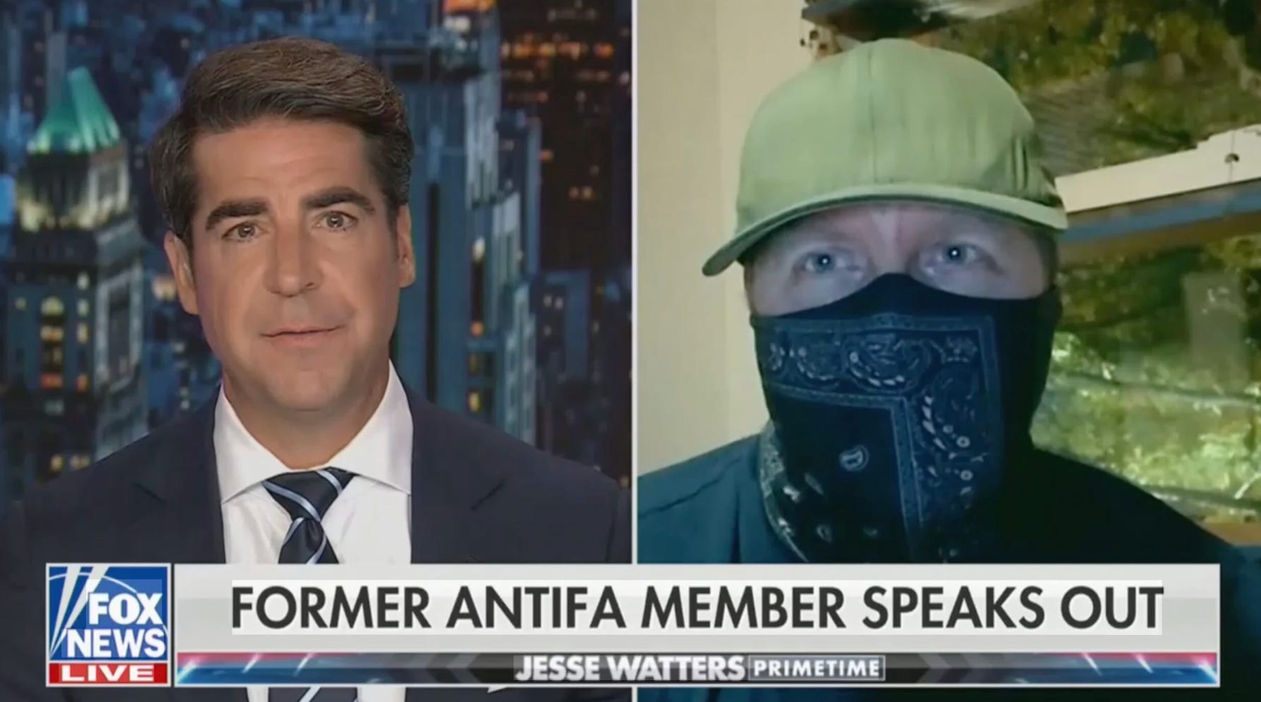 The suggestion that Food Not Bombs could be national security threat continued. On October 3, 2025, Fox New’s Jesse Watters aired “Antifa whistleblower BREAKS SILENCE, warns of violence,” interviewing an actor he calls Eric about how he got involved with Antifa. Watter’s starts by explaining Eric had to disguise himself to protect his life. He goes on asking, “How did you get roped into this whole Antifa thing?” Fake Eric responds, “It stared when I was young. I got in through working with different groups like the ARA, Cop Watch, Food Not Bombs and the punk rock movement.” The pretend former Antifa Eric also refers to the WTO protest in Seattle and claimed he had a copy of the Anarchist Cookbook.