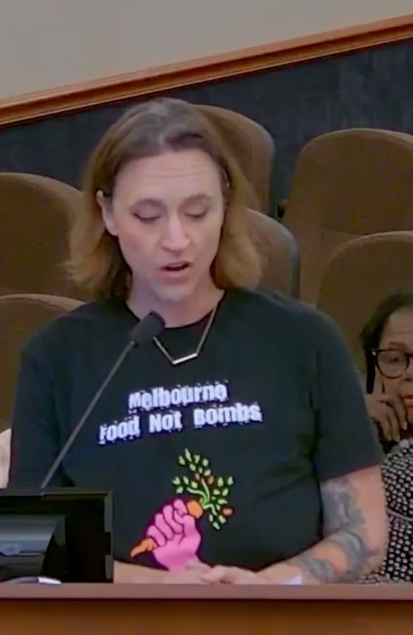 Melbourne Food Not Bombs on the Atlantic coast of Florida successfully pushed back against a local ordinance designed to drive the group from sight. “We are not here to negotiate with you” one volunteer tells City Council. She reminds the council members that the City of Fort Lauderdale was ordered to pay $750,000 to the attorneys that represented Food Not Bombs after the federal courts ruled it was our First Amendment right to share meals without a permit.